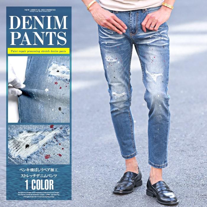 デニム パンツ メンズ ダメージ ペンキ Bitter ビター ペンキ飛ばしリペア加工ストレッチデニムパンツ アンクル クロップド ジーンズ デニムパンツ スキニー 服 Pm 7361 Luxstyle 通販 Yahoo ショッピング